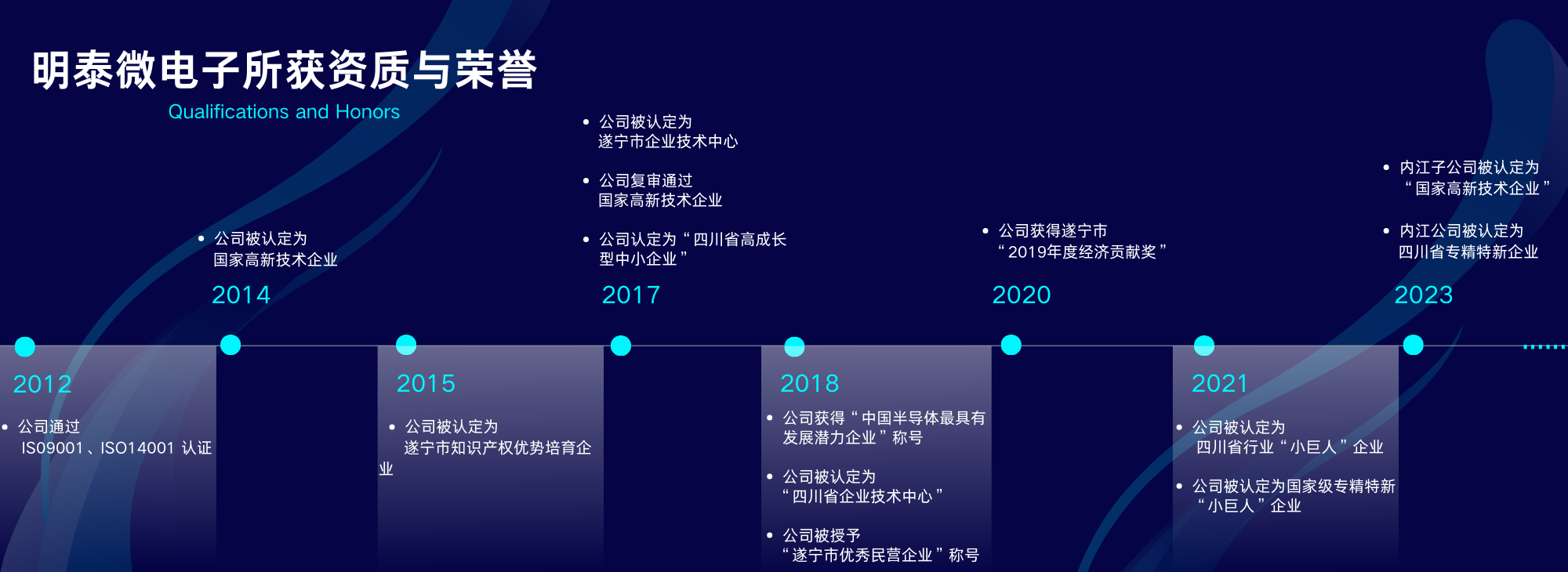 四川明泰電子科技有限公司獲得的資質和榮譽 ?2012年,公司通過ISO9001和ISO14001認證; 2014年,公司認定為“國家高新技術企業(yè)”; 2015年,公司認定為“遂寧市知識產權優(yōu)勢培育企業(yè)”;